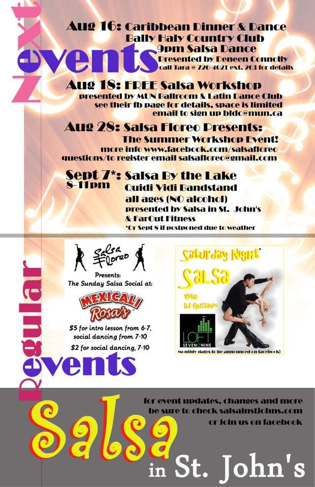Aug/Sept events! August 16, 2012 by JudyD_StacyF_Salsa in Uncategorized Share this: Share on X (Opens in new window) X Share on Facebook (Opens in new window) Facebook Like Loading... Related